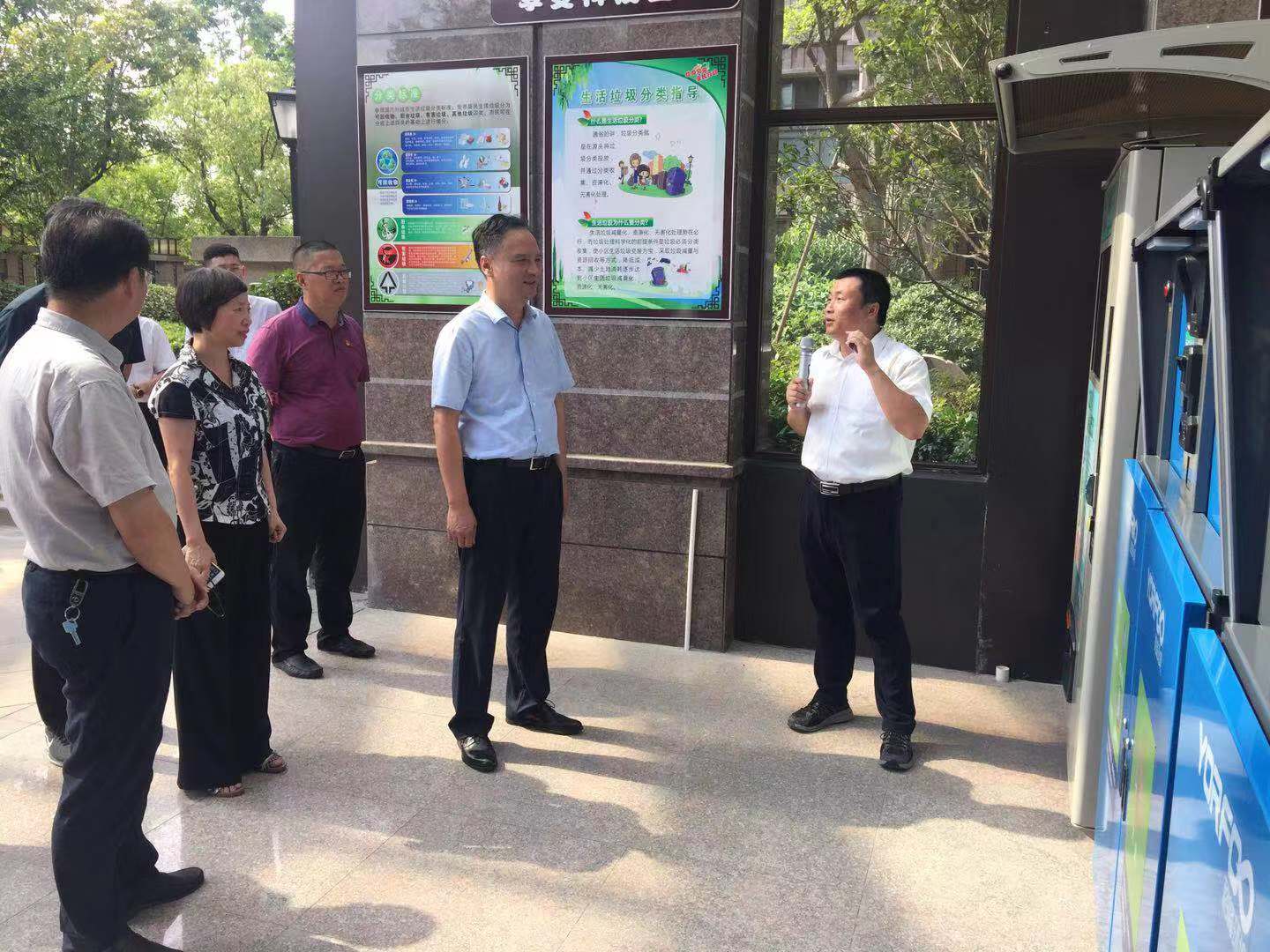 督查期间,督查组考察了桐乡市居民小区垃圾分类示范点大通悦府小区。大通悦府小区作为桐乡市首个生活垃圾源头减量试点小区,通过推行可回收物、有害垃圾、厨余垃圾、其他垃圾等“七分法”,实现了生活垃圾分类投放、分类收运、分类处置,小区的垃圾减量率已达40%以上,厨余垃圾则实现“零外运”。督查组认真考察小区内设立的智能可回收四分类垃圾箱等设施设备,详细了解和询问了小区厨余垃圾的回收、处理机制和运行情况,并实地查看了地下车库的垃圾分类投放点。戴铭对小区的垃圾分类设备设施和管理措施予以了高度评价。