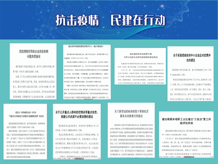 在报送的38篇社情民意信息中,南湖区基层委主委申灏撰写的《关于新型冠状病毒疫情下帮助民营服务企业渡难关的建议》和《建议湖北所有医院降半旗为李文亮医生及所有的疫情死难者致哀》、嘉兴学院支部副主委王卫彬撰写的《关于采取措施扶持中小企业应对疫情冲击的建议》、海宁市基层委副主委陈子强撰写的《因疫情管控导致企业贷款到期问题急需重视》等4篇被民建中央录用;南湖区基层委副主委董建国撰写的《建议修改“突发公共卫生事件应急条例”,对原因不明疾病进行监测预警报告》等28篇被民建省委会录用;秀洲区基层委委员郑宗彪撰写的《关于公开重点人群和防控物资等重点信息,规避公共资源不必要浪费的建议》等14篇被市政协录用,其中:6篇转报省政协,8篇抄送相关部门办理。为疫情防控工作贡献了智慧和力量。