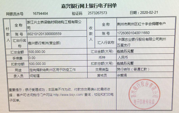 防疫不止,爱心不断。嘉兴民建企业家持续为疫情防控积极奉献爱心,贡献力量。近日,浙江兴土桥梁临时钢结构工程有限公司董事长、嘉兴民建企业家协会副会长朱兴土向市慈善基金会捐款50万元,定向用于湖北省荆州市荆州区疫情防控。他说:为社会贡献自己一份力量是企业家应尽的责任,目前,国家面临的疫情防控形势依然严峻,我们不仅要力所能及的奉献爱心,更要全力以赴的做好企业疫情防控,争取早日恢复生产工作,为“两手抓、都要赢”作出积极贡献。