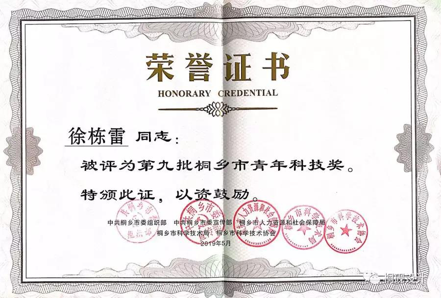 日前,由桐乡市科协联合市委组织部、宣传部、人力社保局、科技局评选出第九批桐乡市青年科技奖、优秀科普工作者。桐乡基层委员会徐栋雷会员荣获“桐乡市第九批青年科技奖”。