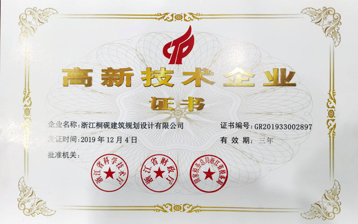 根据国家《高新技术企业认定管理办法》相关规定,经过国家高新技术企业认定管理工作领导小组办公室严格审核,桐砚设计于2016年11月21日荣获“国家高新技术企业”认定,后又在2019年12月4日通过了“国家高新技术企业”的复审认定,并于近日收到了由浙江省科学技术局、浙江财政厅、国家税务总局浙江省税务局联合颁发的《高新技术企业证书》。