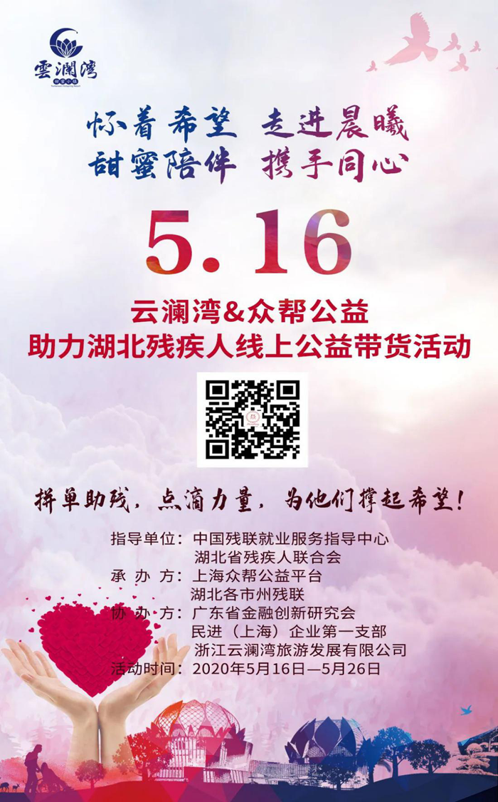 民建嘉兴财经基层委会员企业云澜湾旅游发展有限公司携手上海众帮公益等爱心企业与组织联合发起“湖北残疾人抗疫专场——携手同心”,助力湖北残疾人“助残脱贫决胜小康”!